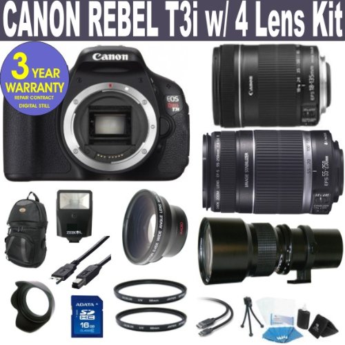 BRAND NEW CANON REBEL T3I w/ CANON 18-135 IS LENS + CANON 55-250 IS LENS + 500mm SUPER TELEPHOTO PRESET LENS + .45X SUPER WIDE ANGLE FISHEYE LENS + 16 GIG MEMORY + 3 YEAR CELLTIME WARRANTY