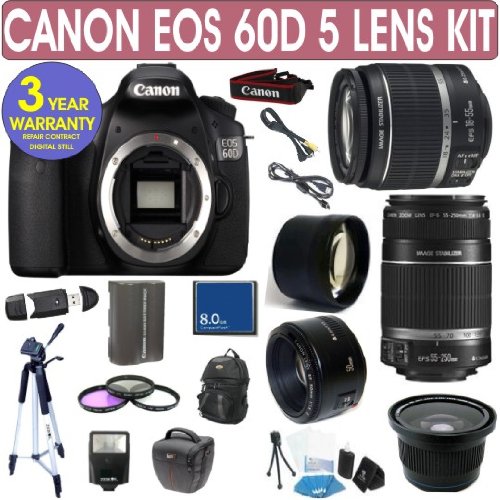 On Sale Canon EOS 60D + Canon 18-55mm Lens + Canon 55-250mm Lens + Canon 50mm Lens + .40x Fisheye Lens + 2x Telephoto Lens + Extra Battery + 3 Year Celltime Warranty Repair Contract