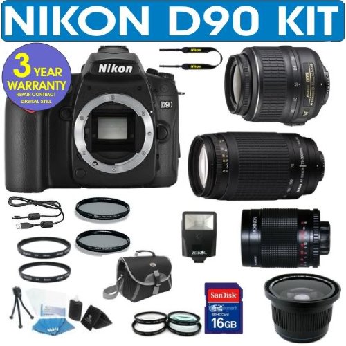 Refurbished Nikon D90 Digital Camera + Nikon 18-55mm VR Lens + Nikon 70-300mm Lens + .40x Wide Angle Fisheye Lens + 500mm Mirror Lens + 3 Year Celltime Warranty